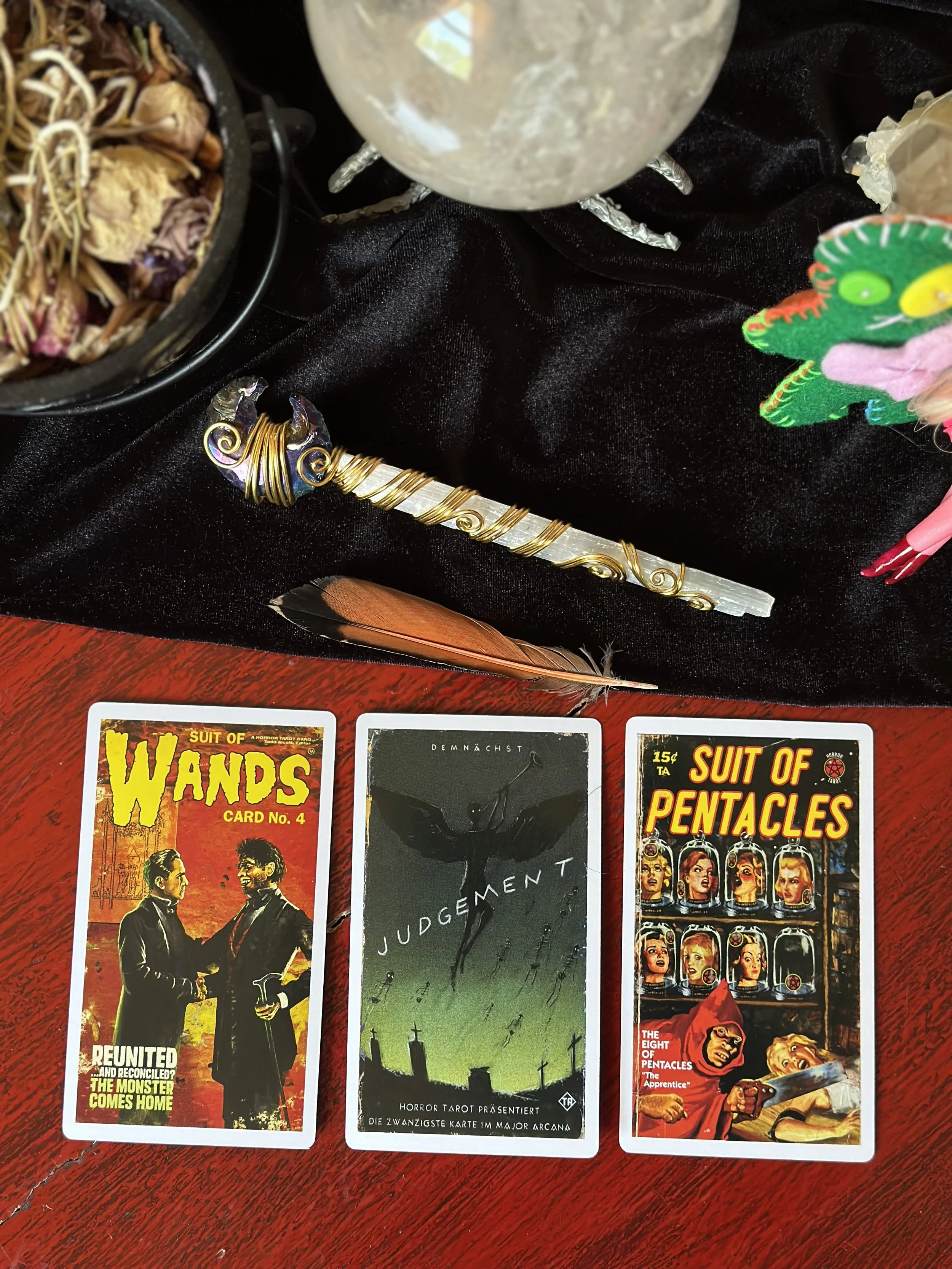 Judgement- Karma. Consequences. Transformation- Judgement brings things full circle. Expect a reaping. Something has reached its natural ending and it's time to relinquish and release it. You are preparing to begin a new cycle. With transformation and change like this, there is inevitably a release of some kind that goes along with it. There is a big re-birth on the horizon for you. Don’t fight it.