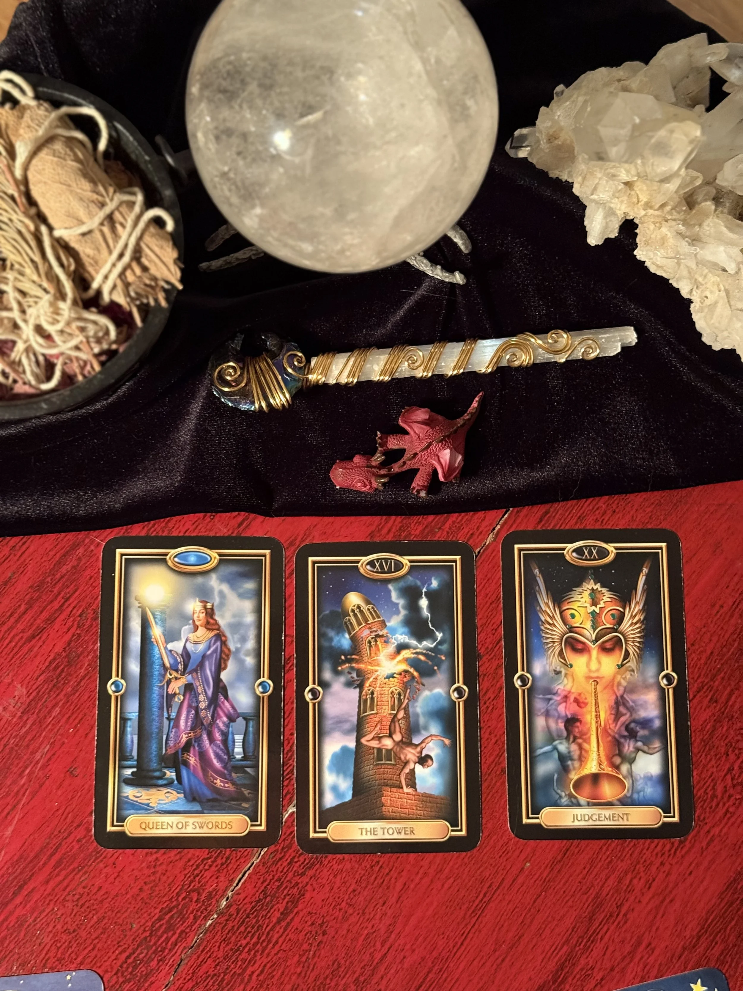 The Tower- Disruption. Collapse. Breakdown- The Tower brings massive disruption your way. Something unexpected occurs and it’s usually a little messy. The changes brought by The Tower are usually made more challenging when we resist them. If things implode this week, look for the lessons and messages involved. The Universe may be trying to help you clean house.