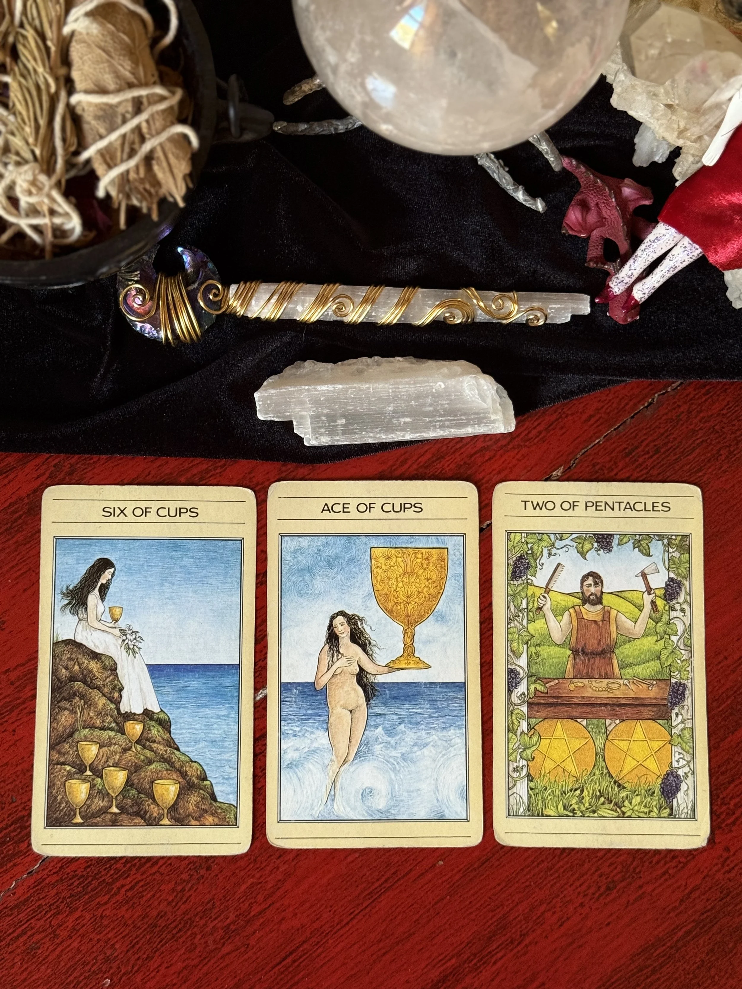 Six of Cups- Nostalgia. Reflection. Dreams- The Six of Cups brings you in touch with something you had wished for in the past but may have given up on. This Six of Cups indicates that a dream from the past may now be possible of manifesting in your future. Take some time this week to consider your heart’s desires for your life. What can you do to move in the direction of them?