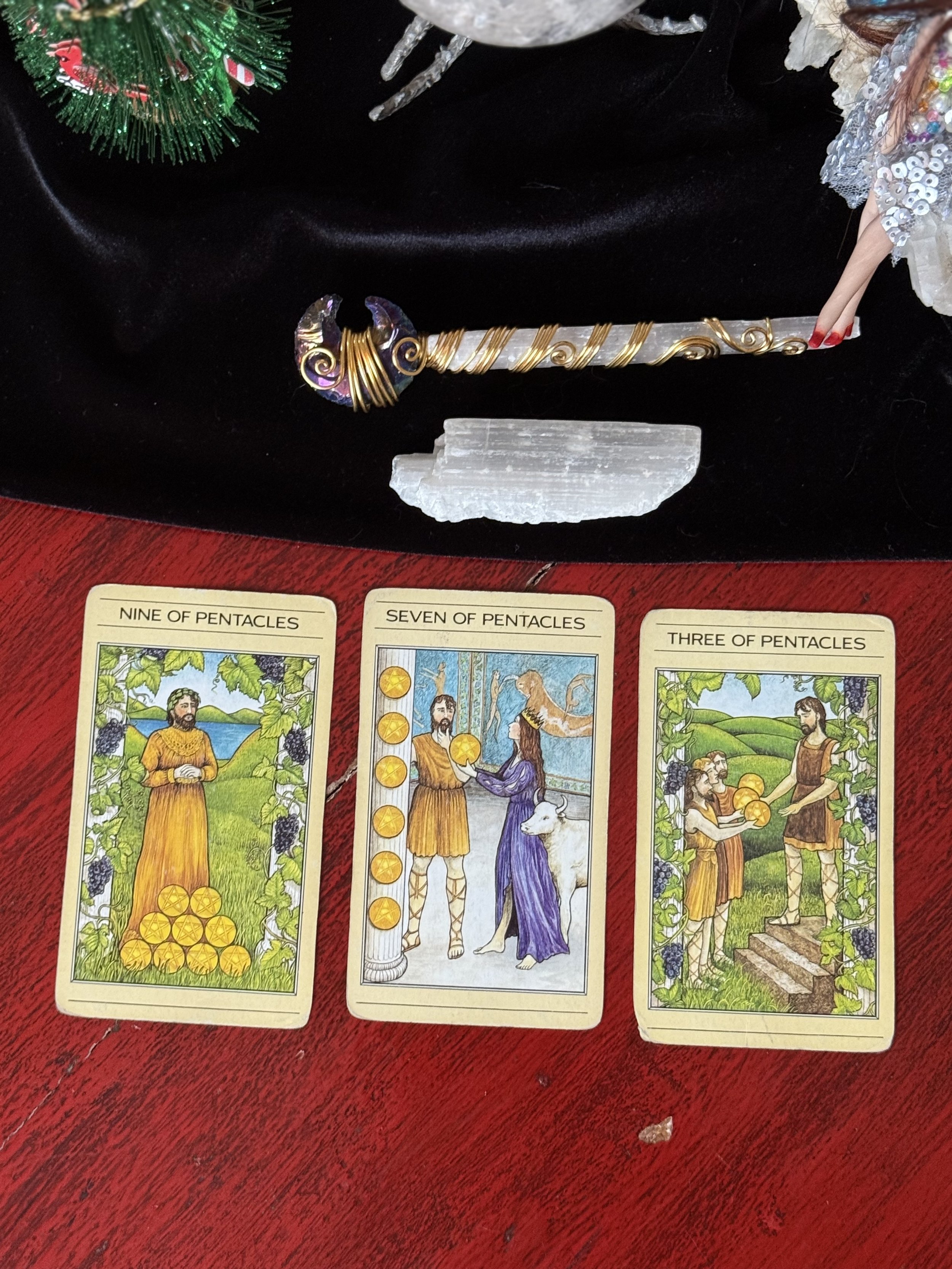 King of Pentacles- Power. Ambition. Manifestation - The King of Pentacles brings stability, power, and success. This King knows what he wants and he doesn’t take “No” for an answer. It’s time to bring some of that confidence into the game. Manifestation only happens when you have clarity. You can’t get what you want until you know what you want. Decide what you want and then go get it.