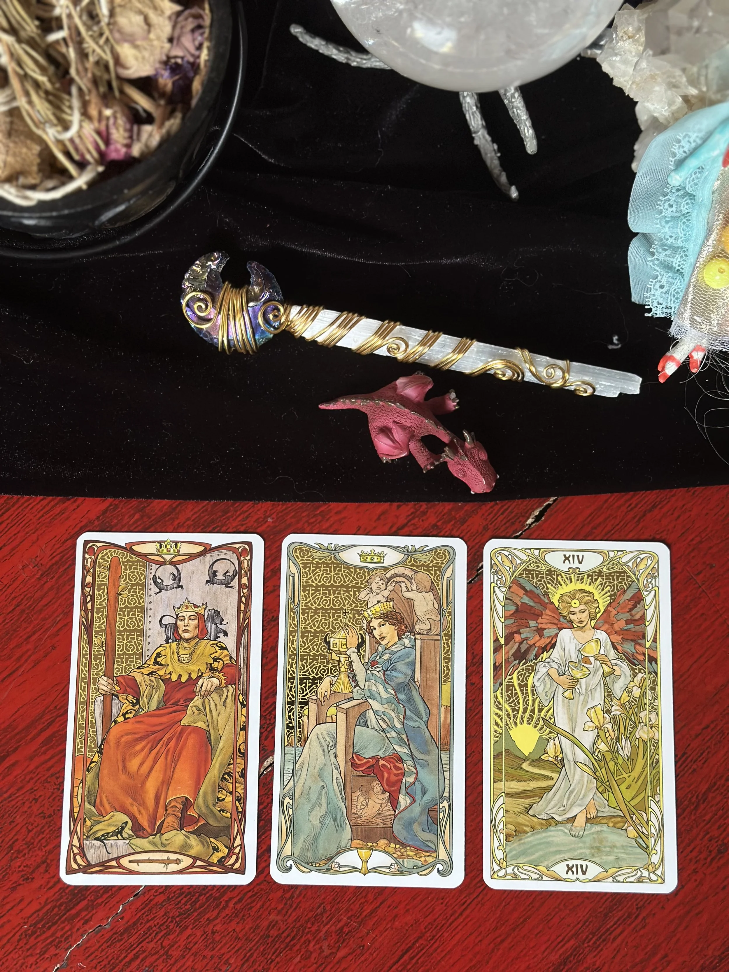 Queen of Cups- Emotions. Intuition. Mystery- The Queen of Cups is the embodiment of emotion. This Queen honors her feelings and knows how to trust her intuition. She is calling for you to tune into your deepest desires and intuitively use your magic to draw them toward you. This Queen is here to help you swim down into the depths to hone in on what you truly desire and wish for.