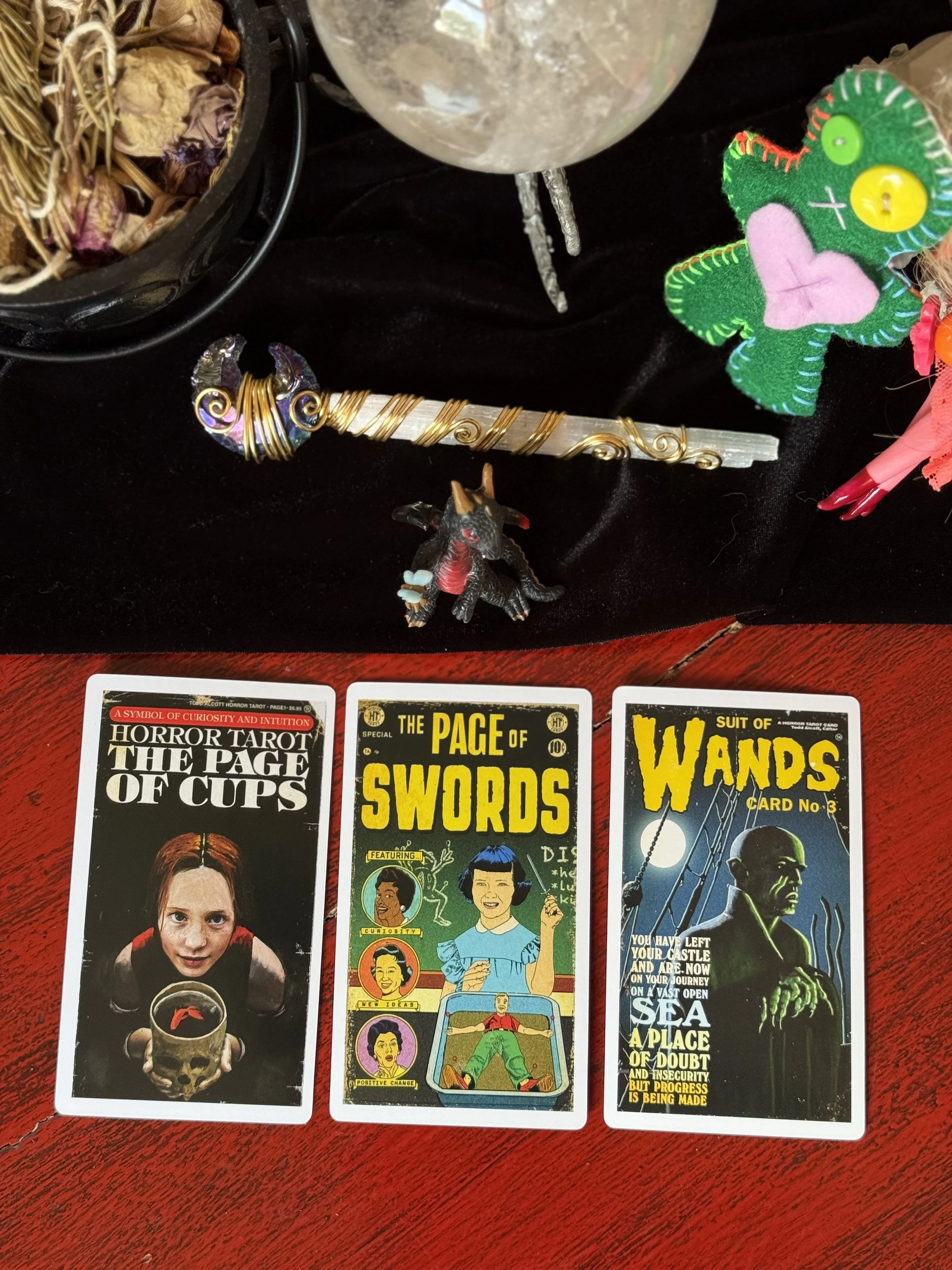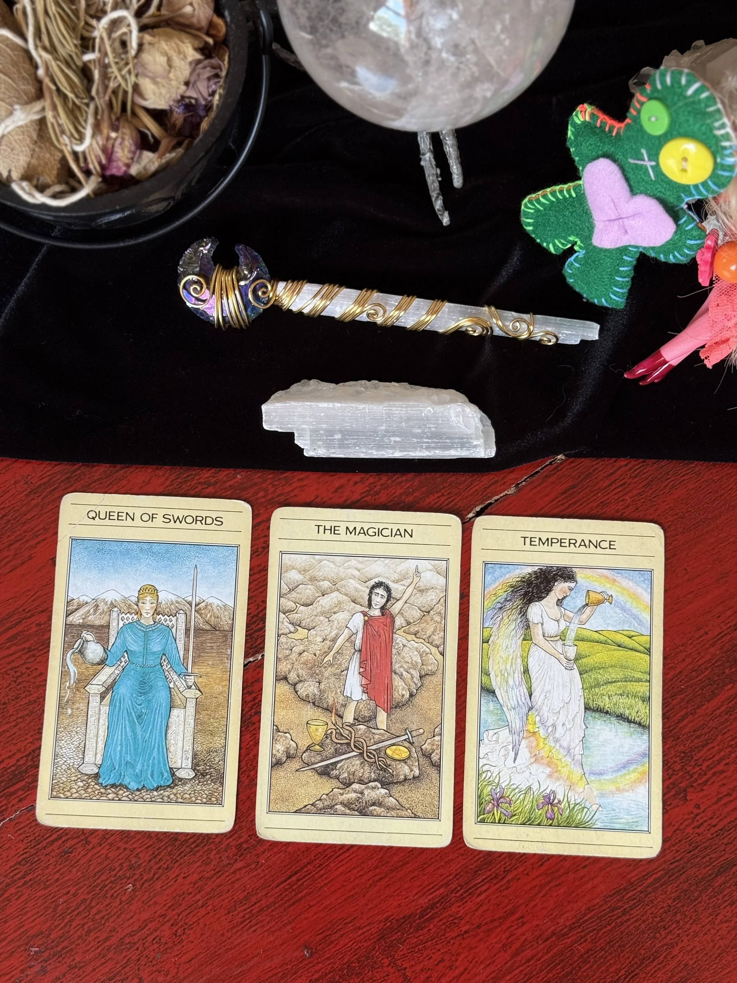 Three of Wands- Vision. Clarity. Potential- The Three of Wands brings validation and early success. It’s time to gather your strength and energy and make decisions about how you’re using it. What are you working on? What are you creating in your life? This Three wants you to get clear on your vision and start making what you want a priority. You have a lot of creative potential, and the Universe is supporting your plans, but you need to focus to create and manifest the things you desire.