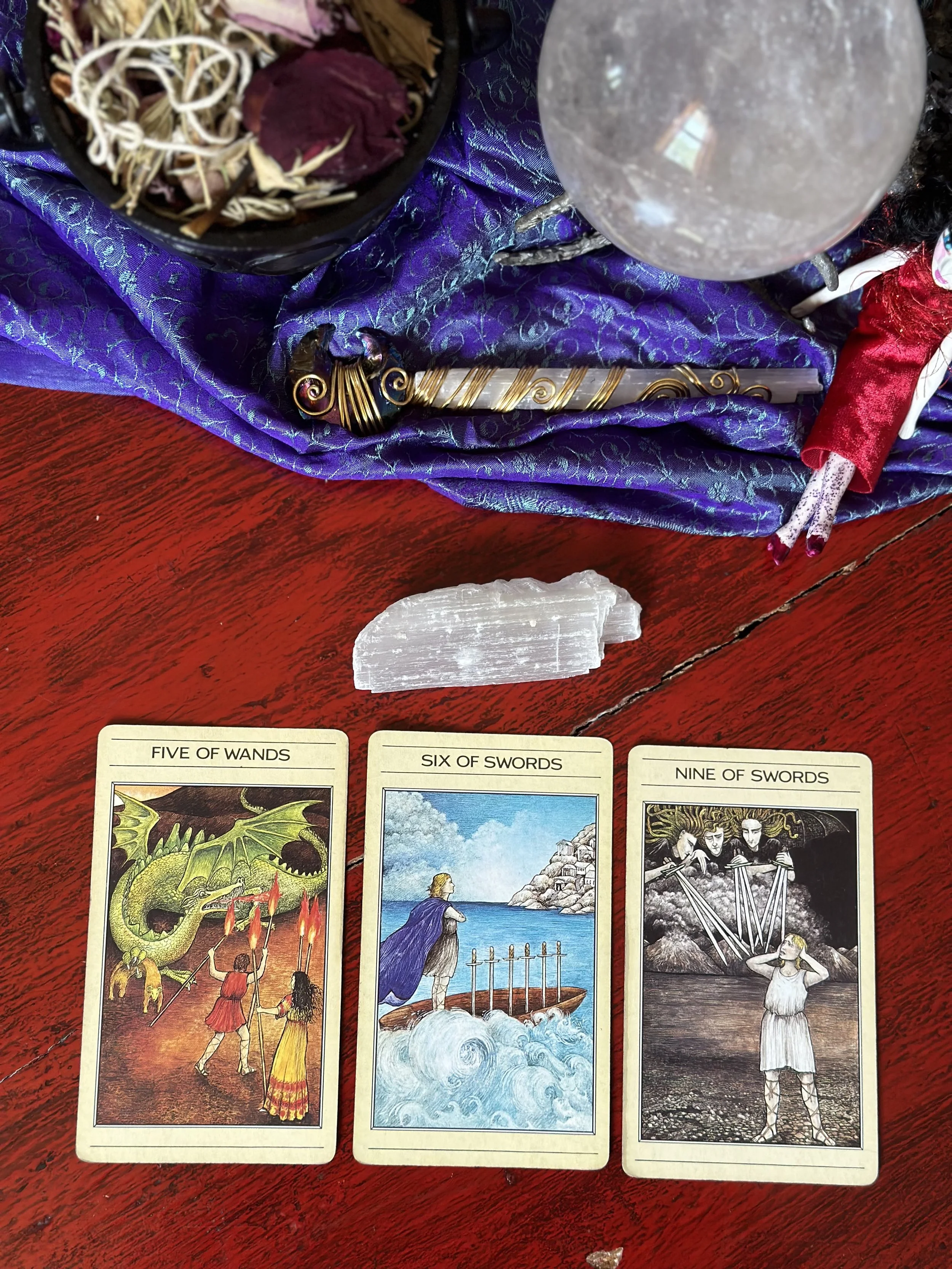 Nine of Swords- Fear. Anxiety. Stress- The Nine of Swords is considered “the card of the nightmare" and brings up great anxiety and foreboding of the future. If you have been feeling stressed and anxious, it’s time to breathe and take a step back. You are obsessing and making things worse than they actually are. Maybe write down your worries or talk them out with a friend. You are letting your anxiety get the best of you, and it isn’t serving you well right now. It’s time to take back your power and breathe it down.