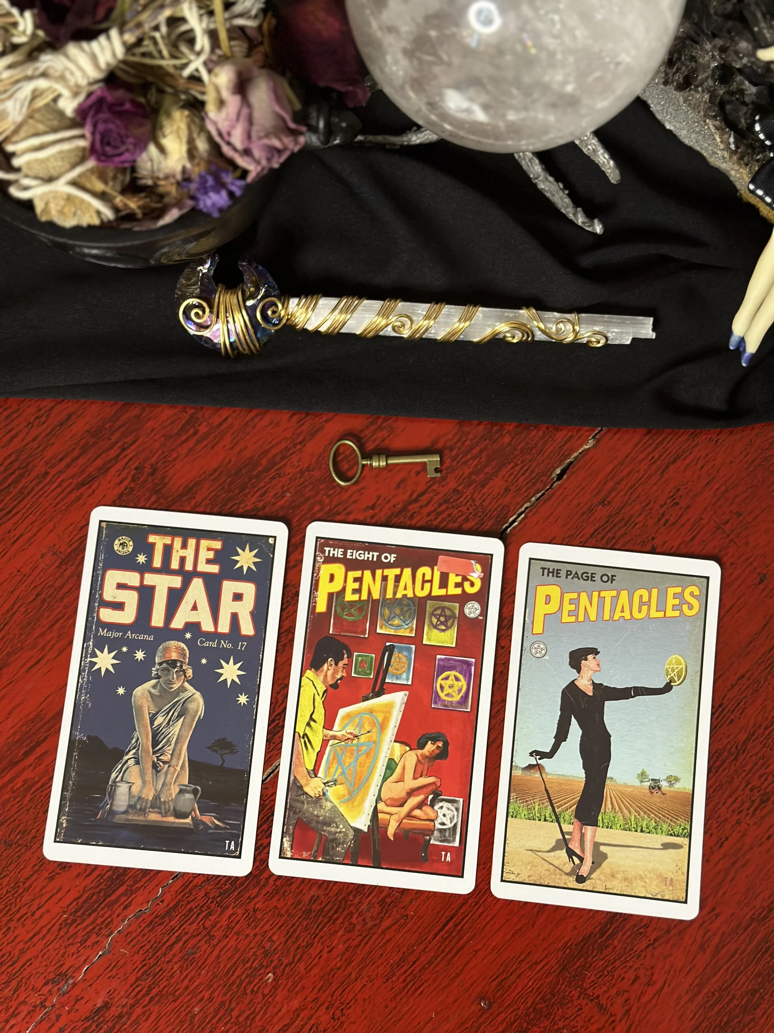 Queen of Pentacles- Abundance. Fertility. Stability- The Queen of Pentacles is reminding you to stand strong and calm in your power. This Queen brings abundance, fertility, and success wherever she goes. She doesn’t need to go chasing after anything because she excels at manifesting. She just stands steady in her magic and life blooms into abundance around her. Let her show you how it’s done. Your message for this week is to get in touch with your body, love yourself up, and manifest from a place of calm, centered, magic.