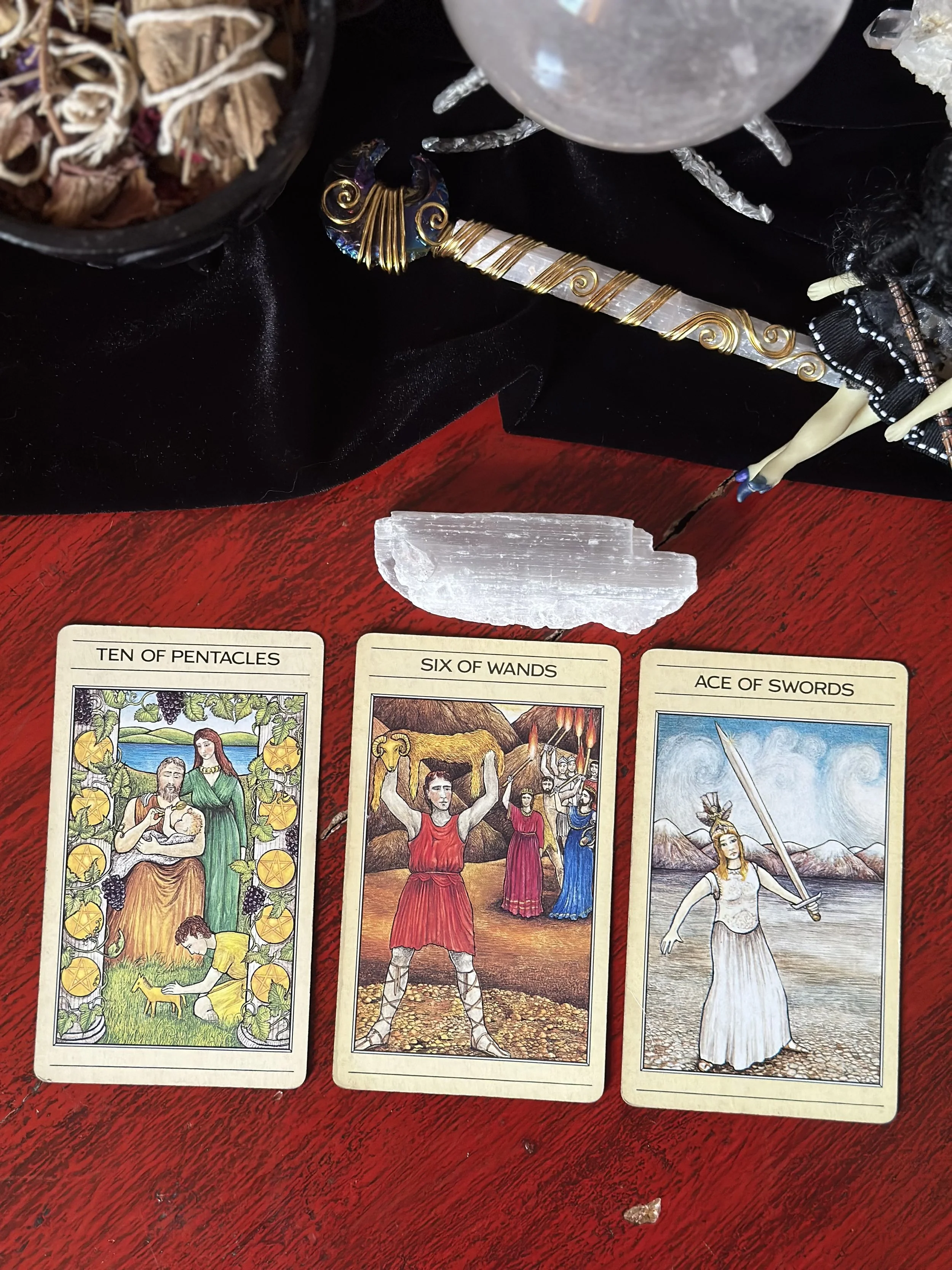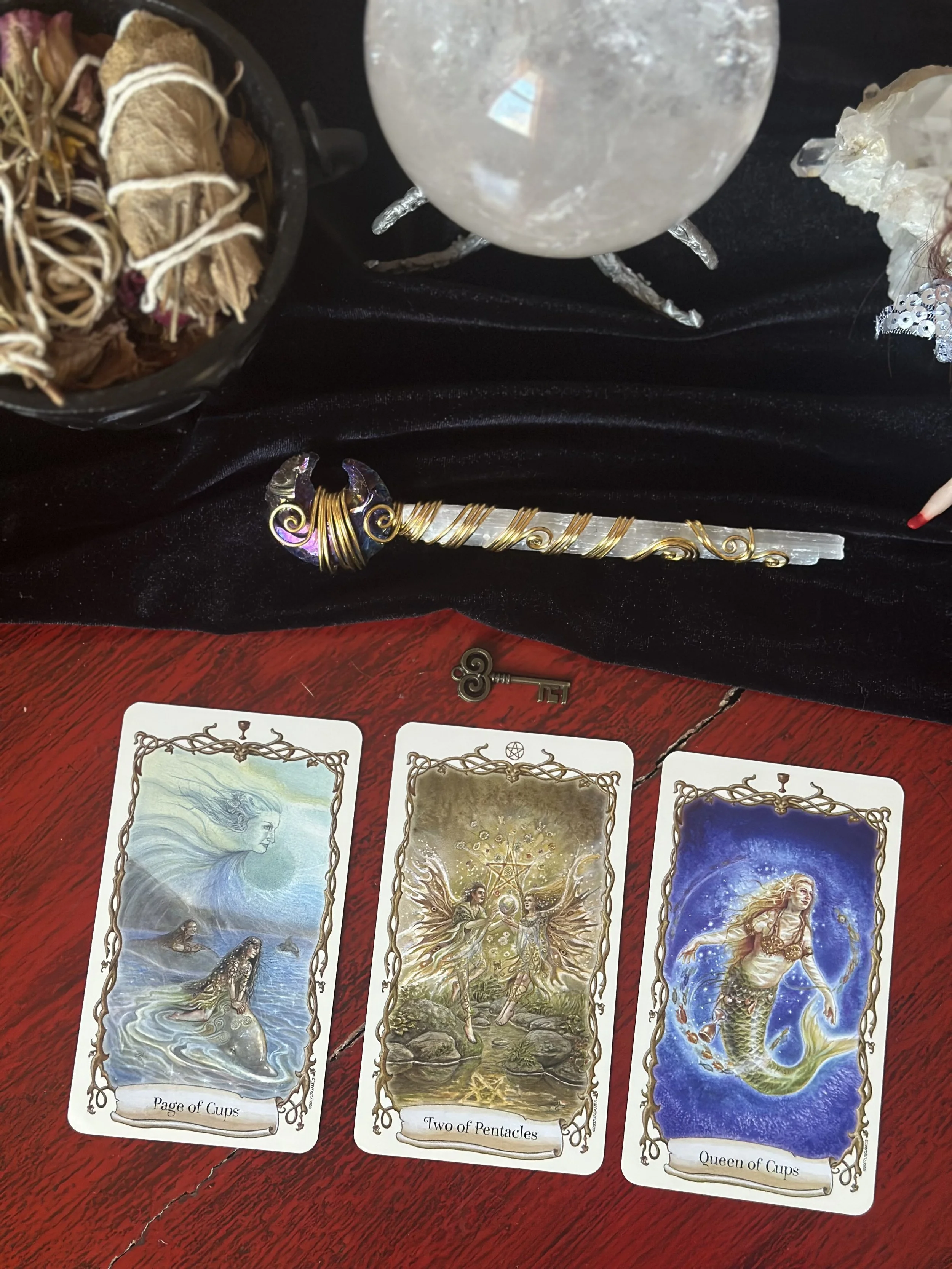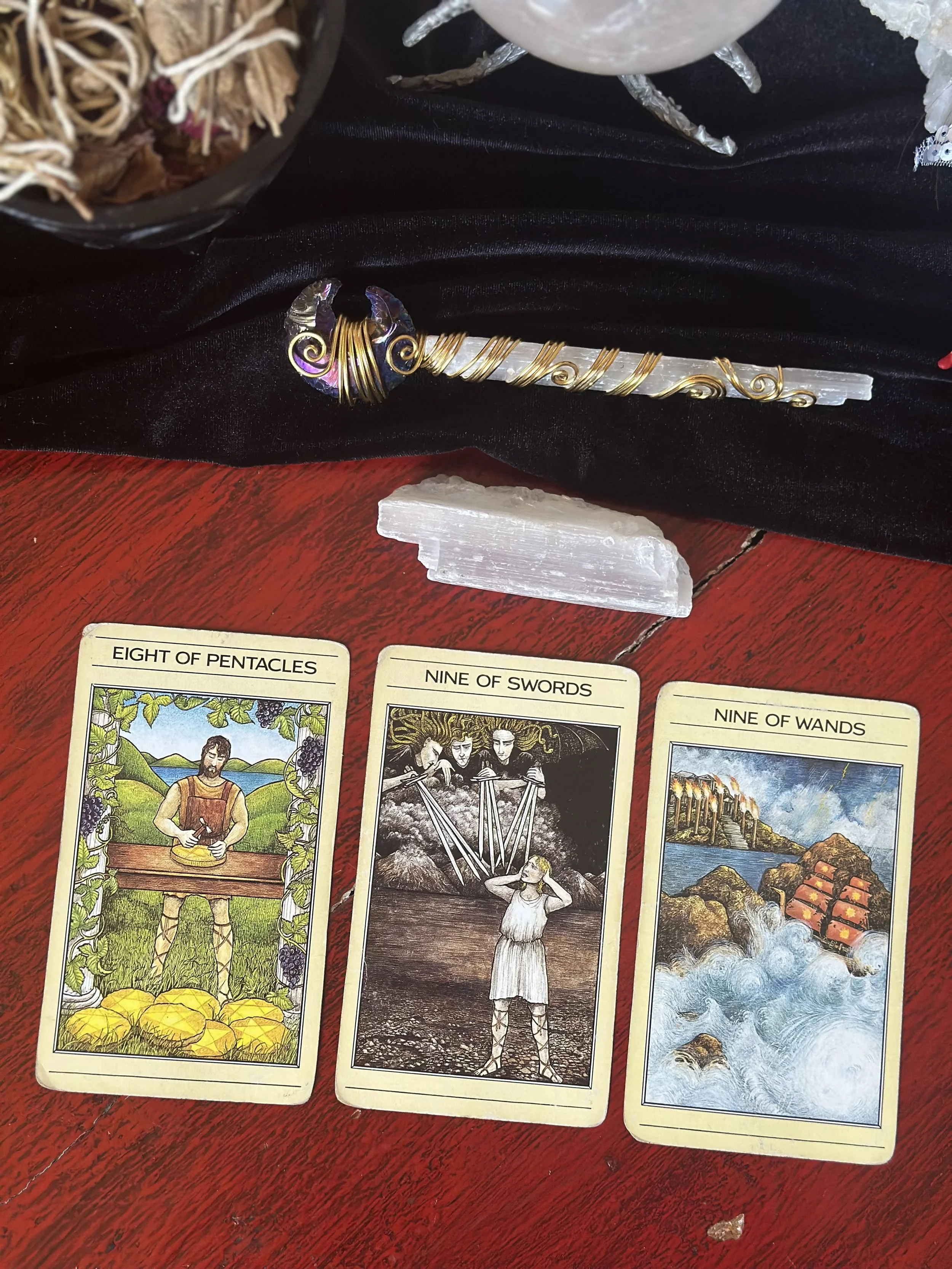 Three of Wands- Satisfaction. Achievement. Optimism- The Three of Wands indicates early success. Energies are coming together and it seems The Universe is supporting your plans. It is important to acknowledge the growth and process you have made, but there is still work to be done, so you need to stay strong and steady and not get complacent. Keep your focus this week and don’t let yourself get distracted.
