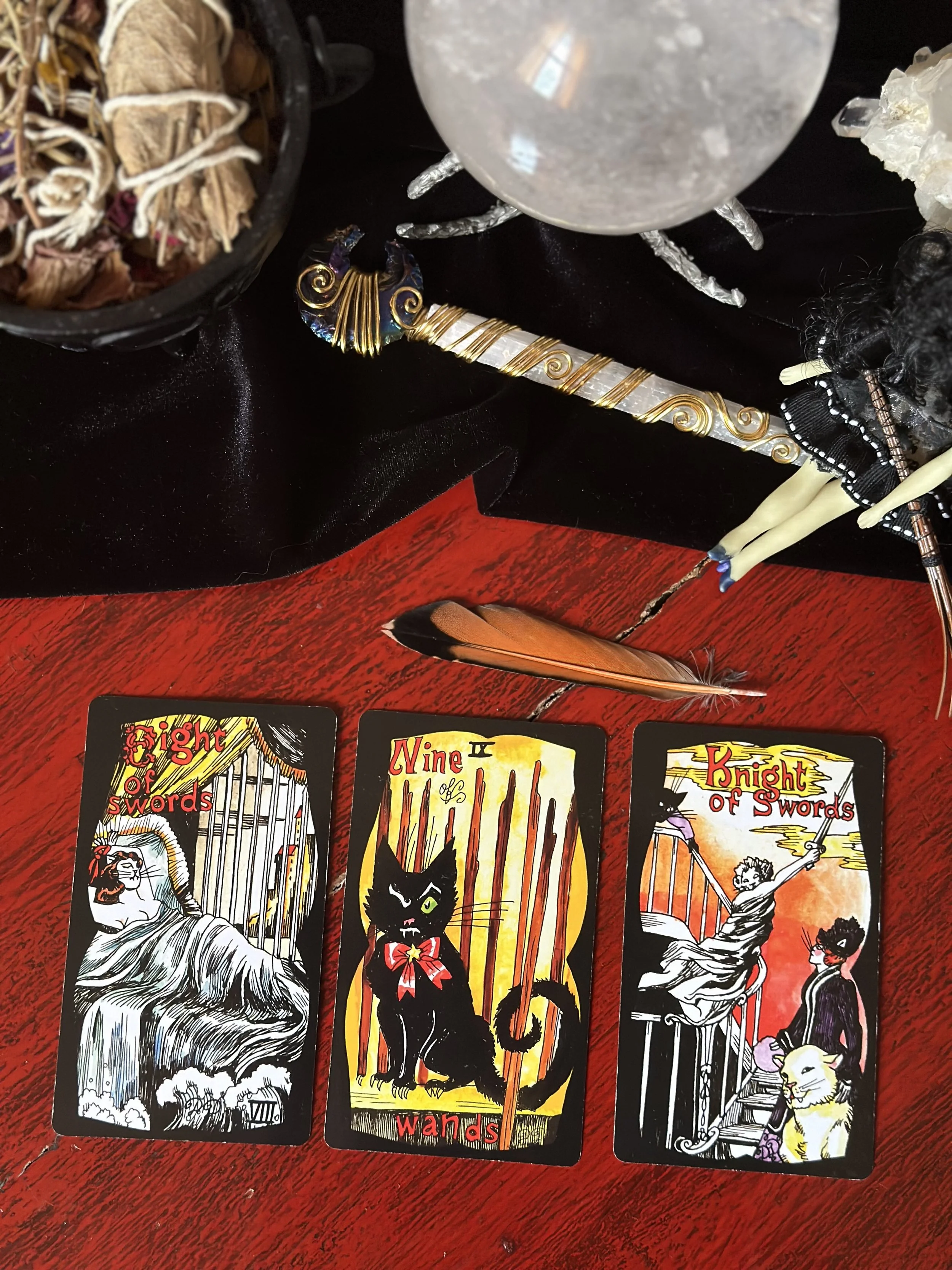Knight of Wands- Quick change. Inspiration. Fun- Expect the unexpected in the best way possible this week. Inspiration is coming for you! This might take the form a person who charges in and inspires you, or it could be a new idea that magically appears. The important thing to keep in mind is to stay open and pay attention. This Knight rides in hot and heavy and brings a good time along with him.